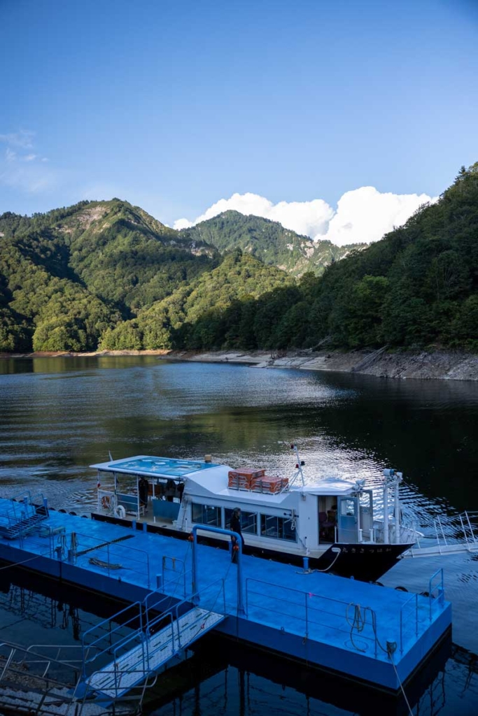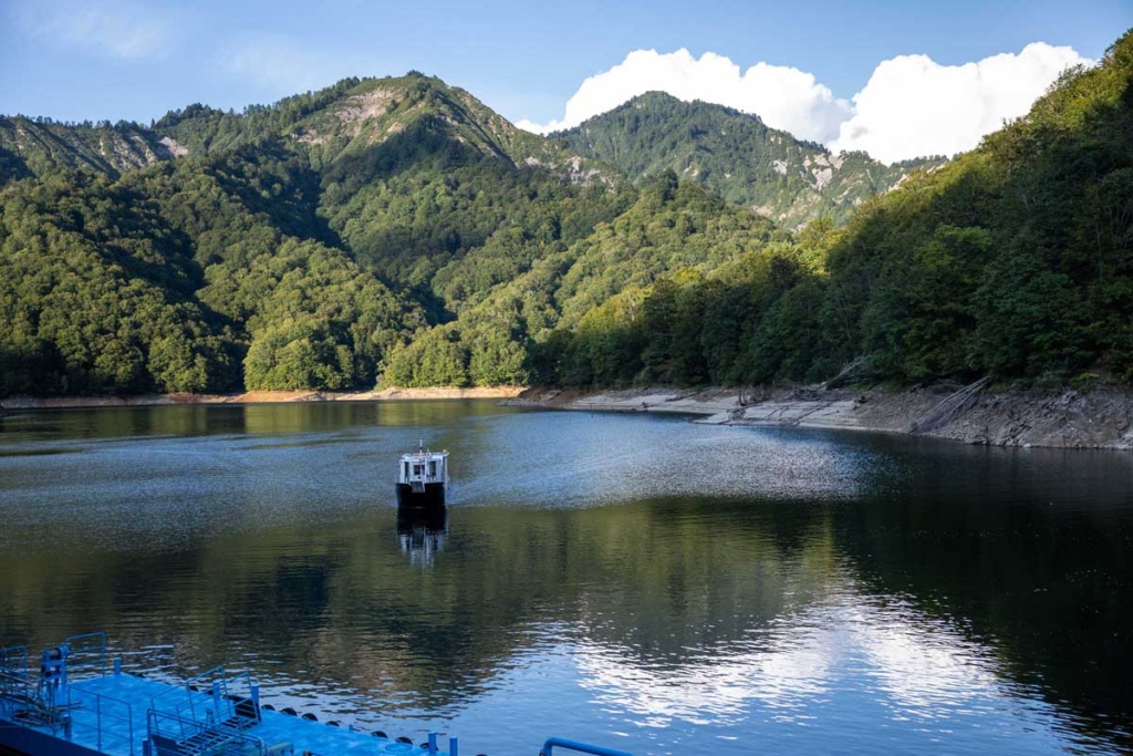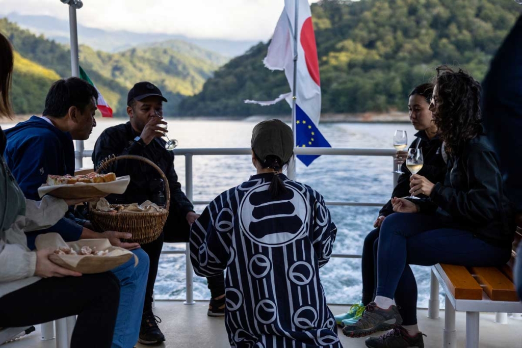 After descending from Oze, enjoy a graceful transfer by private boat. On board, a welcome tasting of sake and regional delicacies awaits, offering an intimate and elegant moment as you glide across the breathtaking scenery of Lake Oku-Tadami.